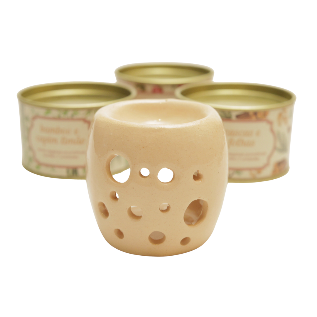 1 difusor modelo rechaud + 1 lata com 7 ceras aromáticas